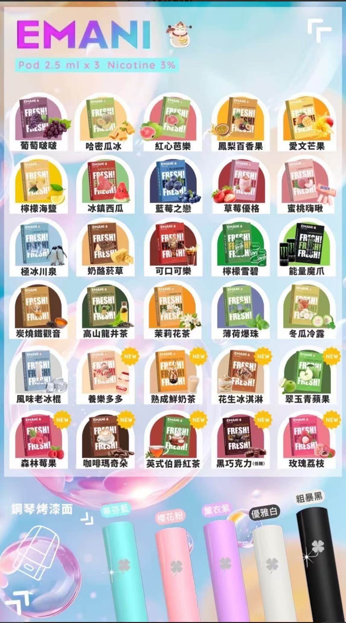 30 款以上風味選擇:從香甜草莓牛奶到清新冬瓜茶、經典可口可樂再到果香濃郁的覆盆莓,Emani 提供多達 30 種以上風味選項,讓每一次吸食都充滿驚喜。
