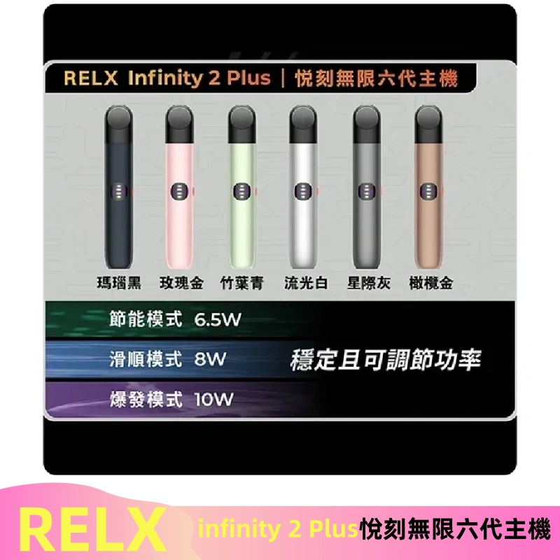 RELX六代主機,也稱為RELX Infinity,是悅刻品牌推出的一款高端電子煙設備,旨在提供卓越的使用體驗。時尚簡約的設計,機身採用高品質的鋁合金材質,手感舒適且堅固耐用。支持無線充電和快速充電,充電更便捷。使用Type-C介面進行快速充電,充電速度更快。搭載最新的FEELM陶瓷霧化技術,提供穩定且豐富的煙霧量和更純淨的口感。RELX Infinity以其優雅的設計、高效的霧化技術和便捷的使用體驗,成為電子煙市場中的佼佼者,深受用戶喜愛。